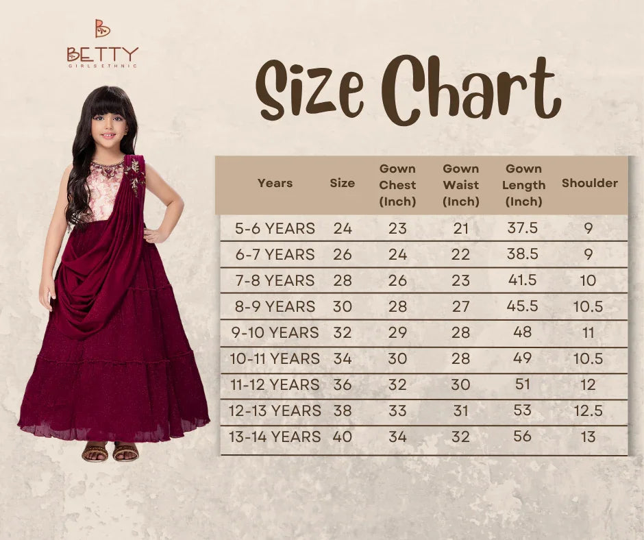 Add regal flair to your little girl’s ethnic wardrobe with this Betty Burgundy Draped Gown. Featuring a beautifully embroidered bodice and an elegant stitched drape across the shoulder, this outfit combines Indo-western charm with festive elegance. Perfect for weddings, sangeet nights, or Diwali parties.