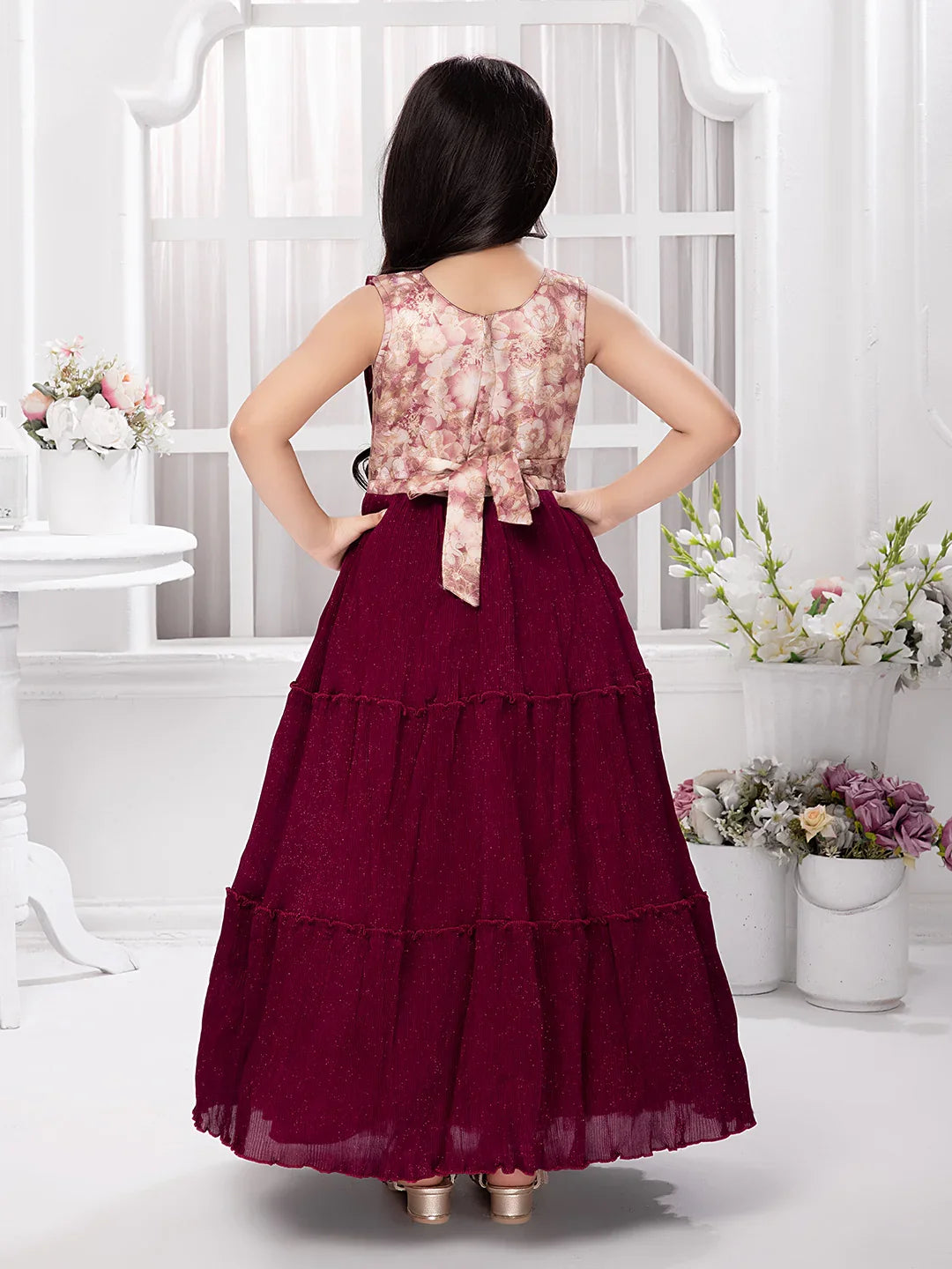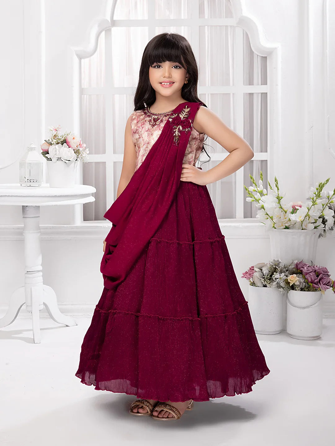 Wine Draped Shoulder Gown for Girls – Sleeveless Party & Festive Dress