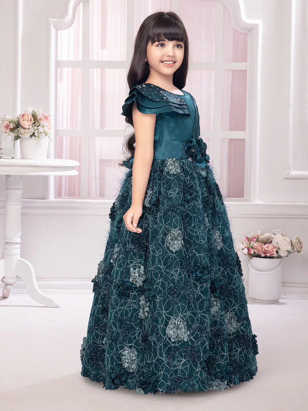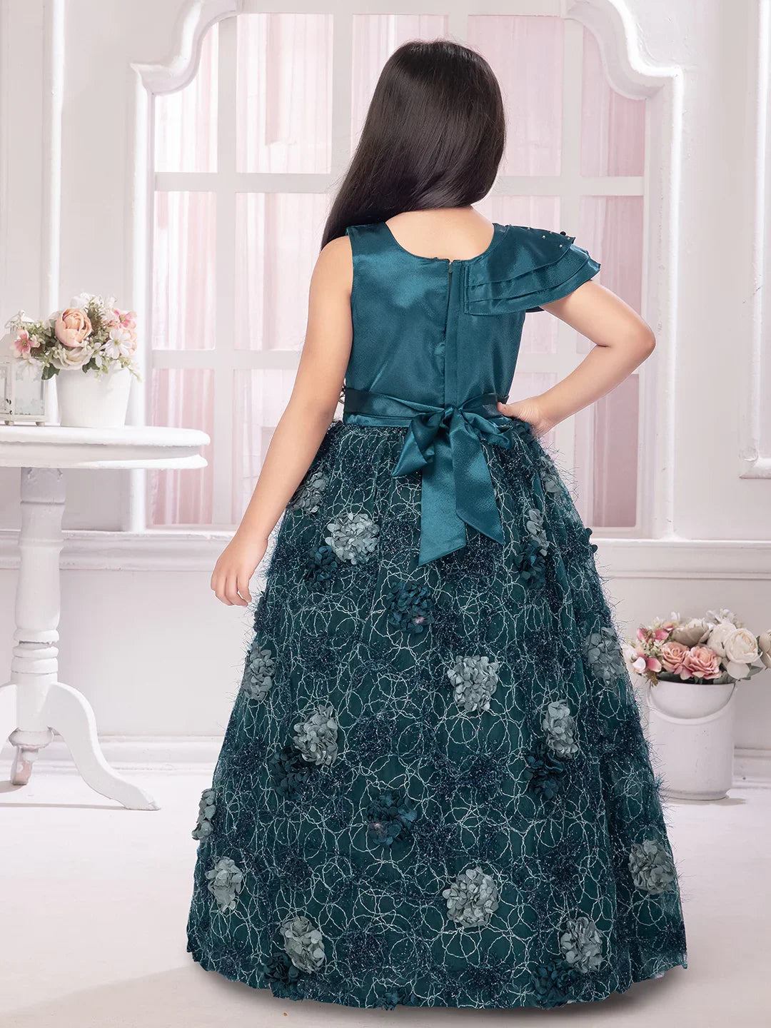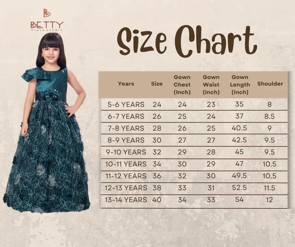 Elevate your girl's festive style with this majestic Betty Emerald Green Gown. Designed with a satin bodice featuring delicate pleats, pearl embellishments on one shoulder, and a floral appliqué waistline, this gown flows into a full net skirt adorned with intricate 3D floral textures. A perfect choice for weddings, receptions, and grand celebrations.