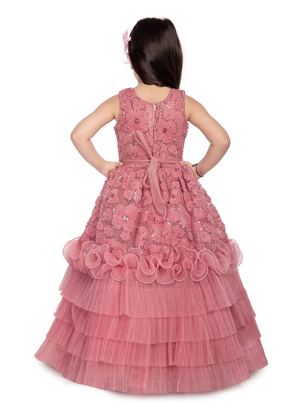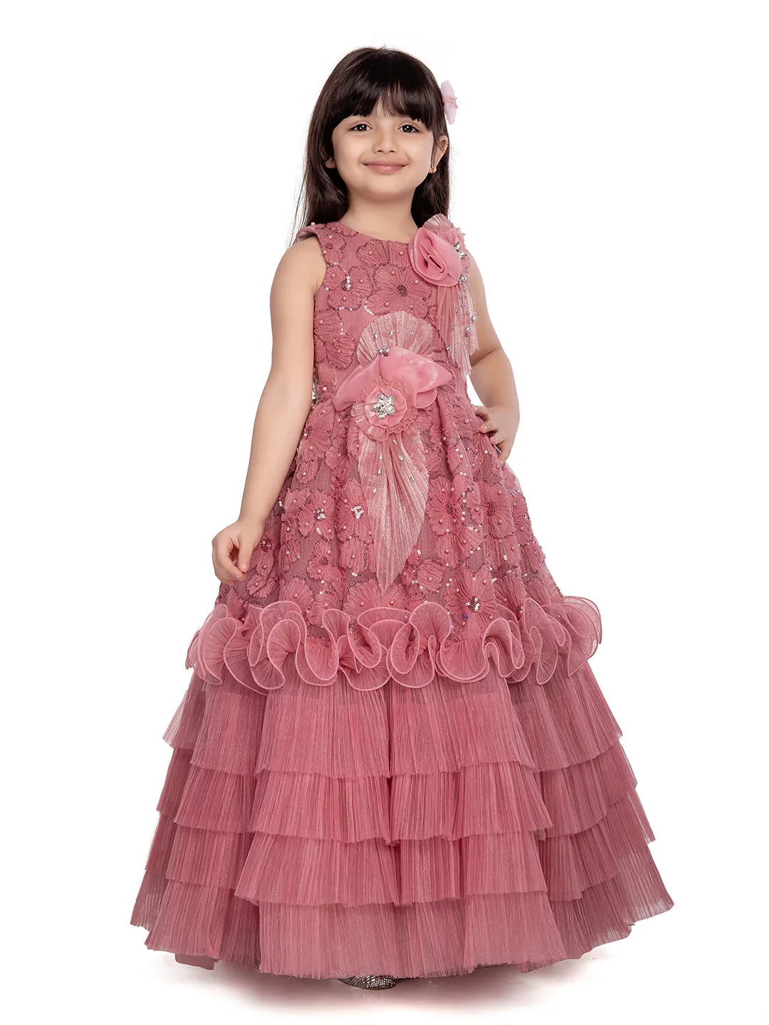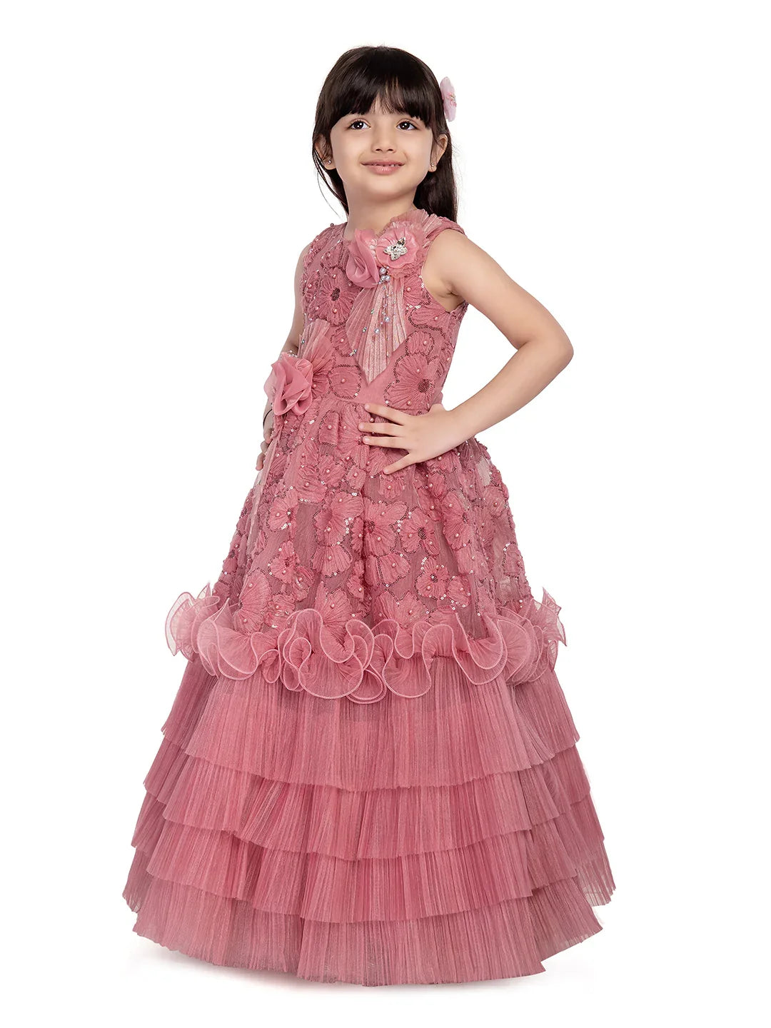 Betty Pink Embroidered Layered Gown with Floral Detailing – Girls' Party Dress