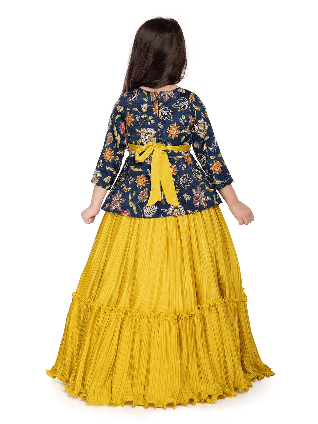 Dress your little one in festive charm with this Betty Yellow & Navy Embroidered Gown. This unique Indo-western outfit features a floral embroidered navy bodice with three-quarter sleeves, a round neckline, and a pleated yellow flared skirt. A side-drape and beaded detailing add a graceful ethnic flair—perfect for festivals, family gatherings, and wedding celebrations.