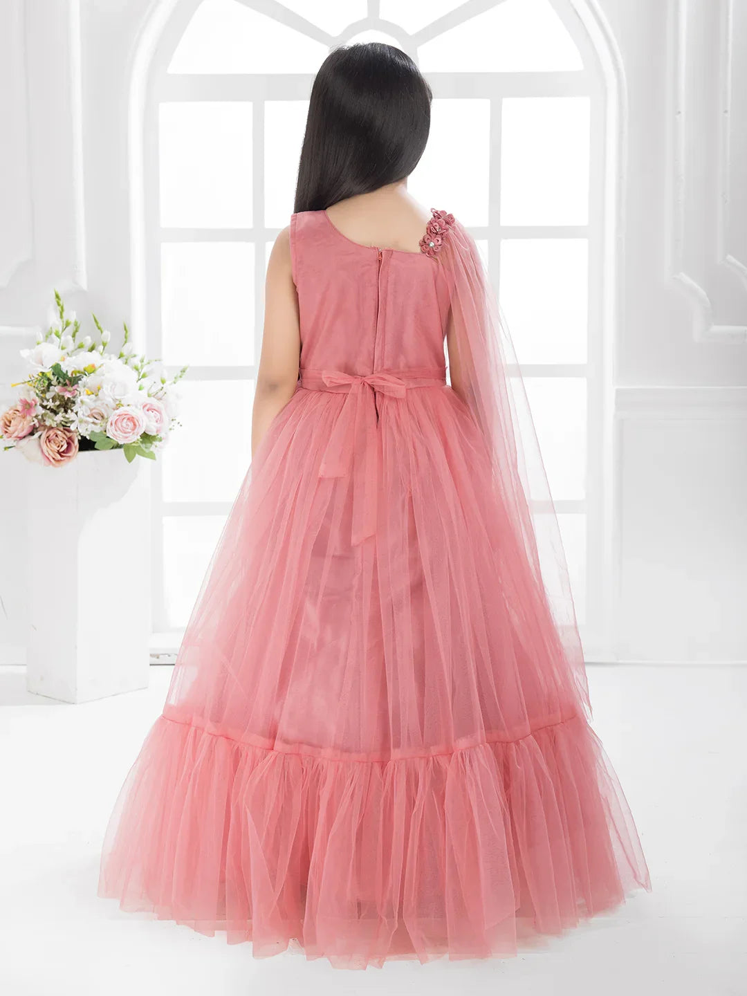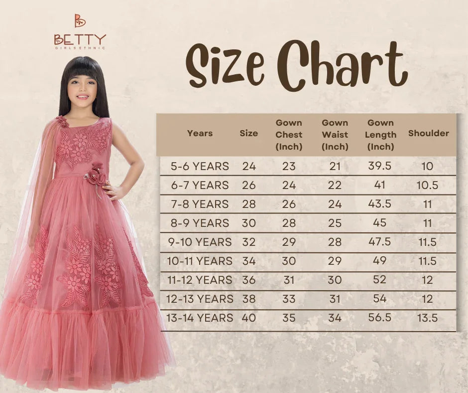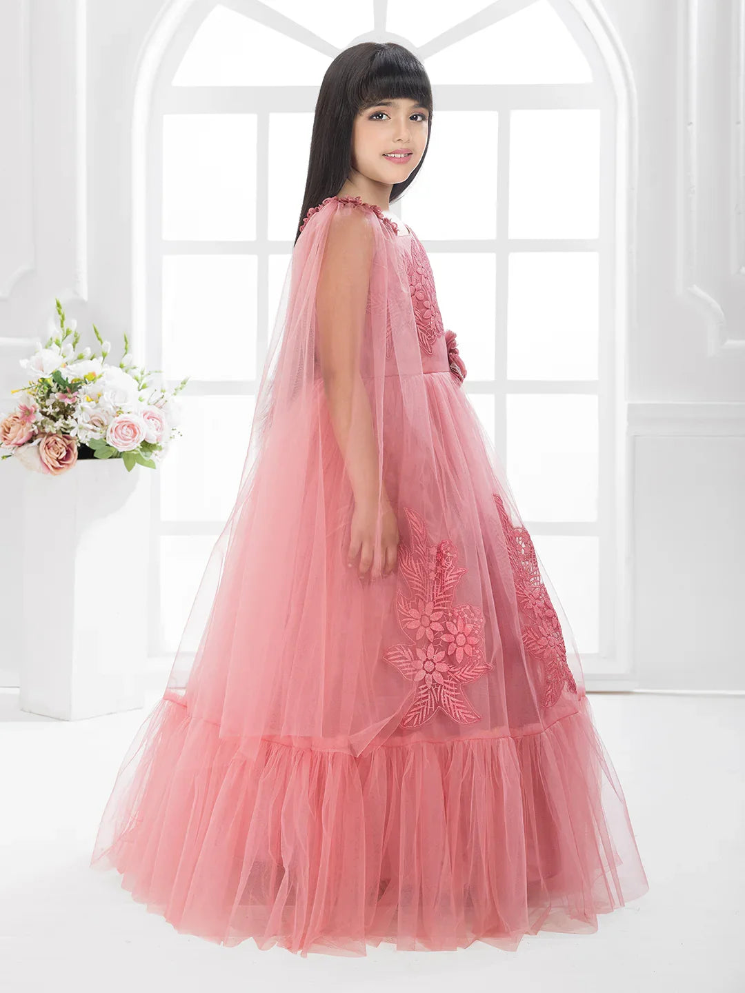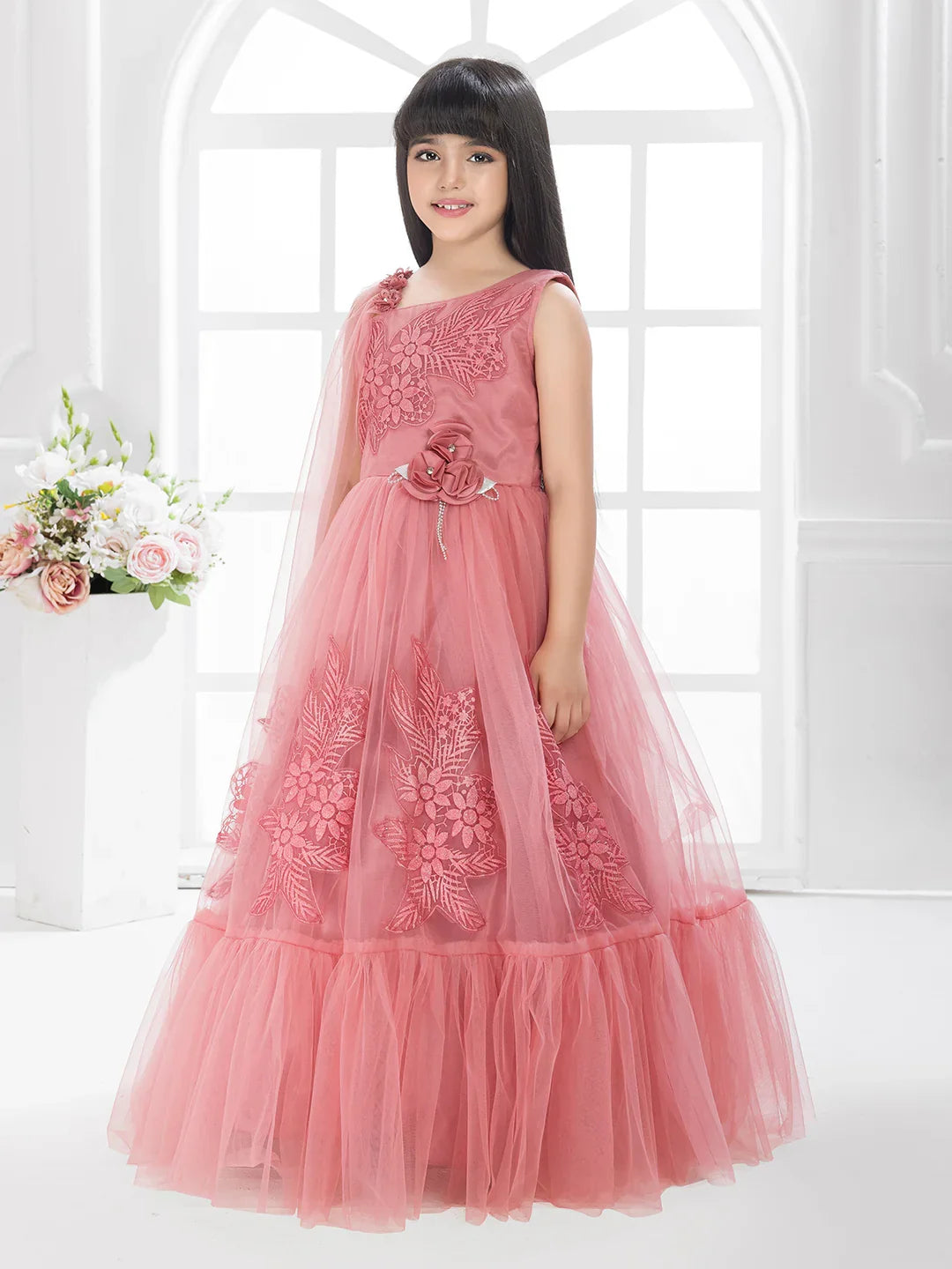 Give your little princess the perfect festive makeover with this elegant Pink Embellished Gown Dress by Betty. Designed in soft net fabric with stunning floral appliqué details, this fit & flare gown features a pre-attached shoulder drape and a floral waist patch for a royal look. Its full-length flare and sleeveless design make it ideal for weddings, birthdays, or any grand occasion.