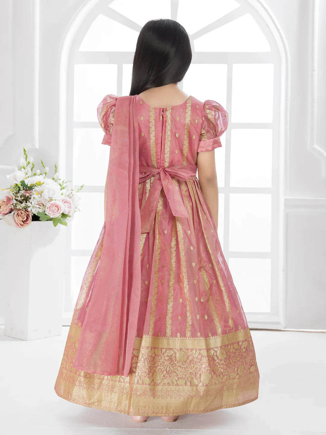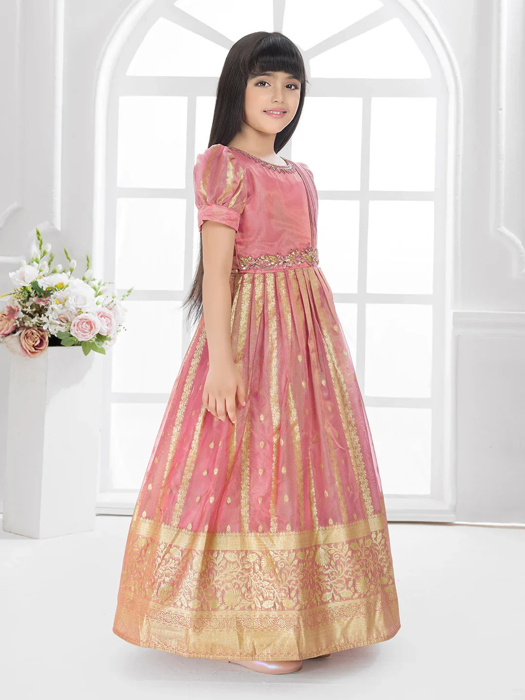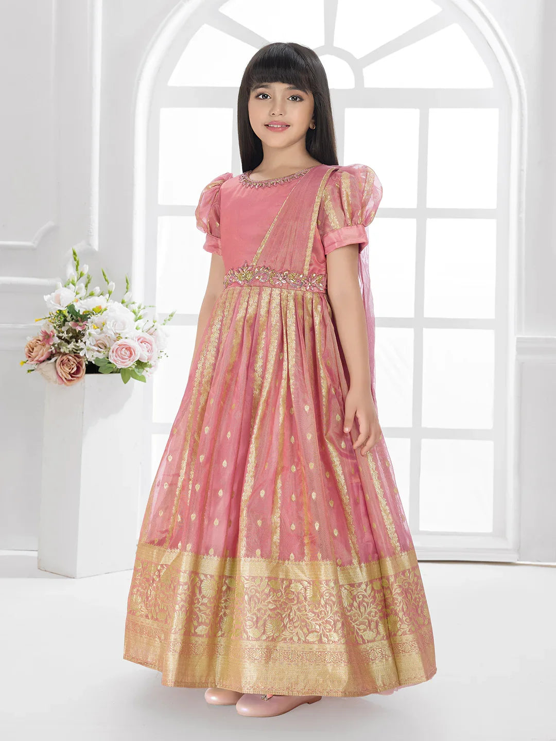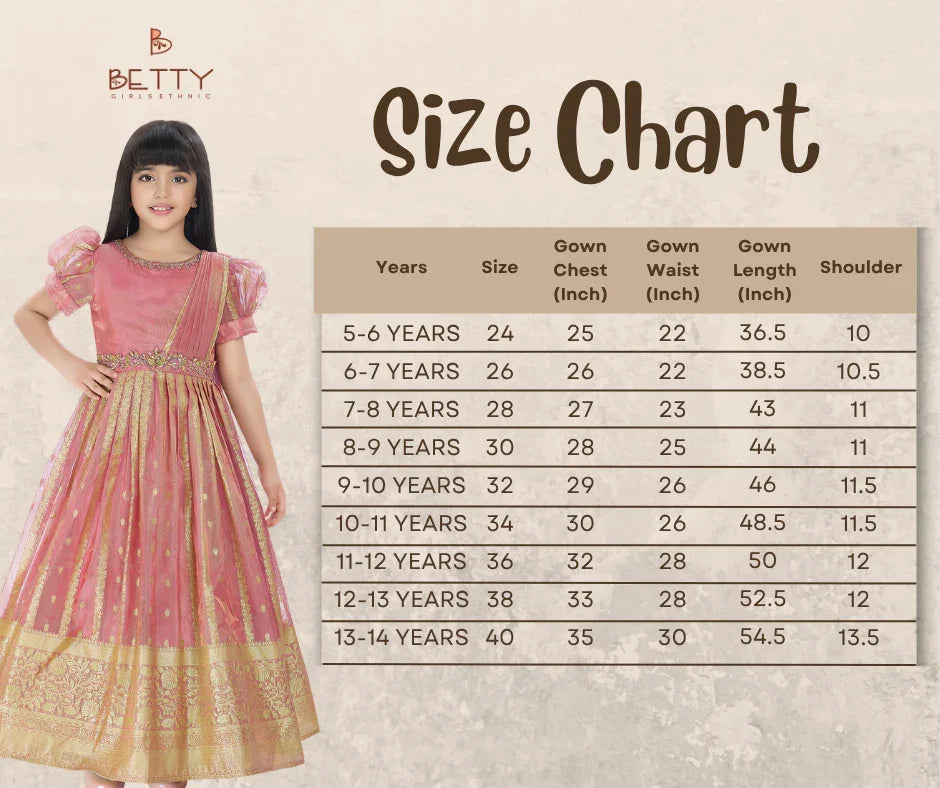 Let your little one step into elegance with this graceful Pink Ethnic Motif Flared Gown crafted from luxurious poly silk. Accented with gold zari motifs, a flared hemline, and charming puff sleeves, it’s a perfect blend of tradition and contemporary charm – ideal for weddings, Navratri, or any grand celebration.